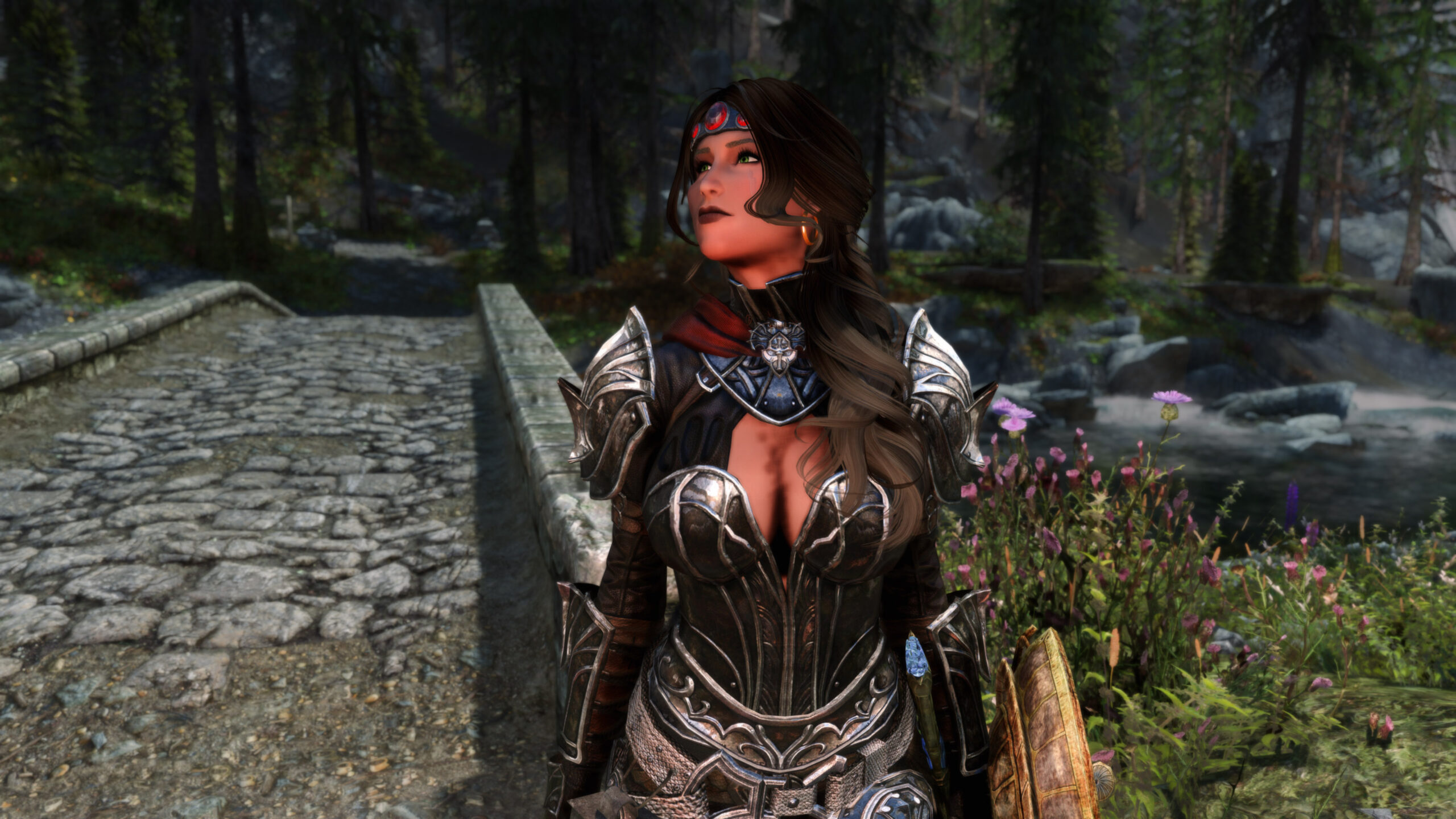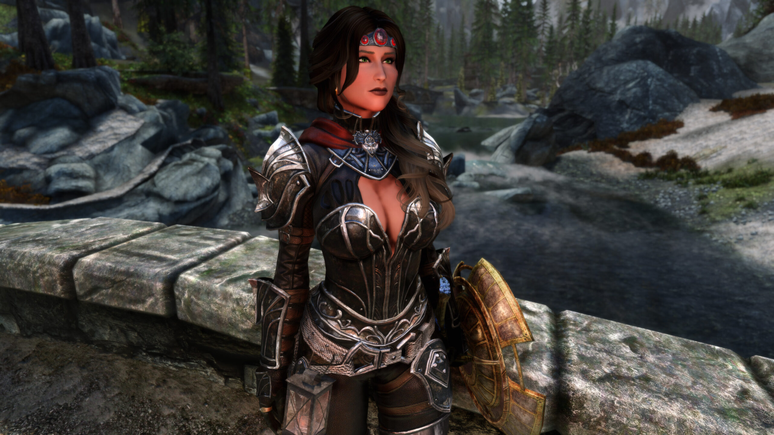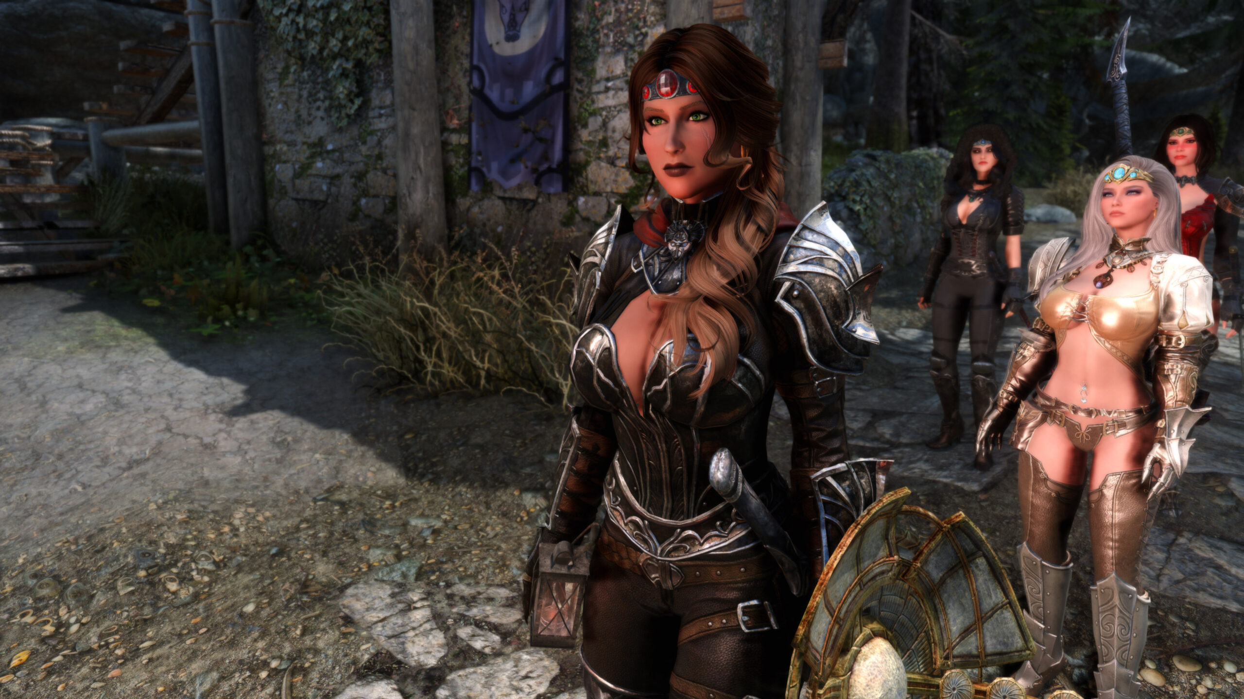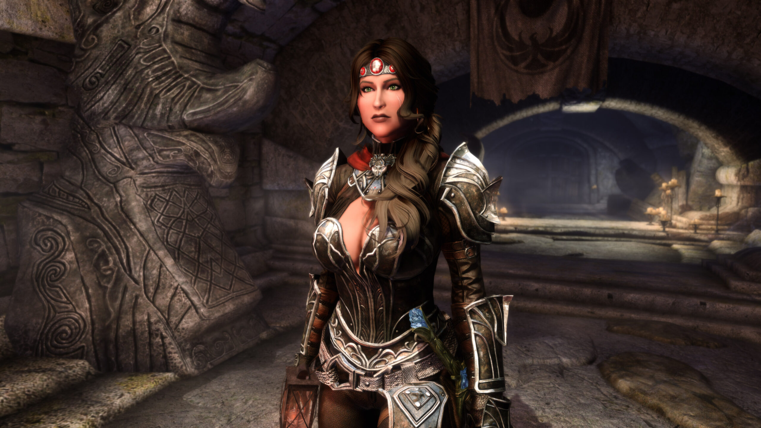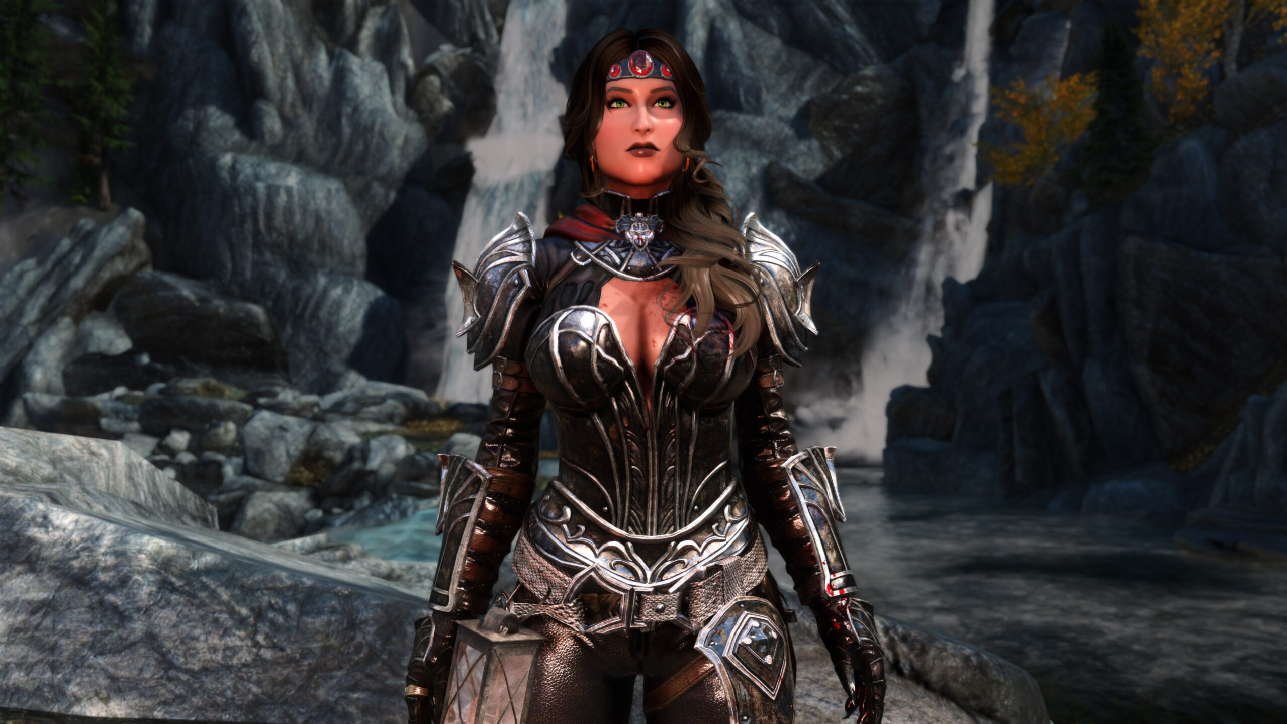 Gwen has been around for over 7 years now. She is my go-to when I want to just play Skyrim. She is a fearless leader, (sometimes too fearless). Tallest woman in Skyrim, biggest woman in Skyrim and one of the most ferocious fighters. Probably, pound for pound she has the biggest boobs in Skyrim along with a over muscular bubble butt, thanks to Dibella and her enhancements; Gwen leads without question and is the tank / barbarian of the group.