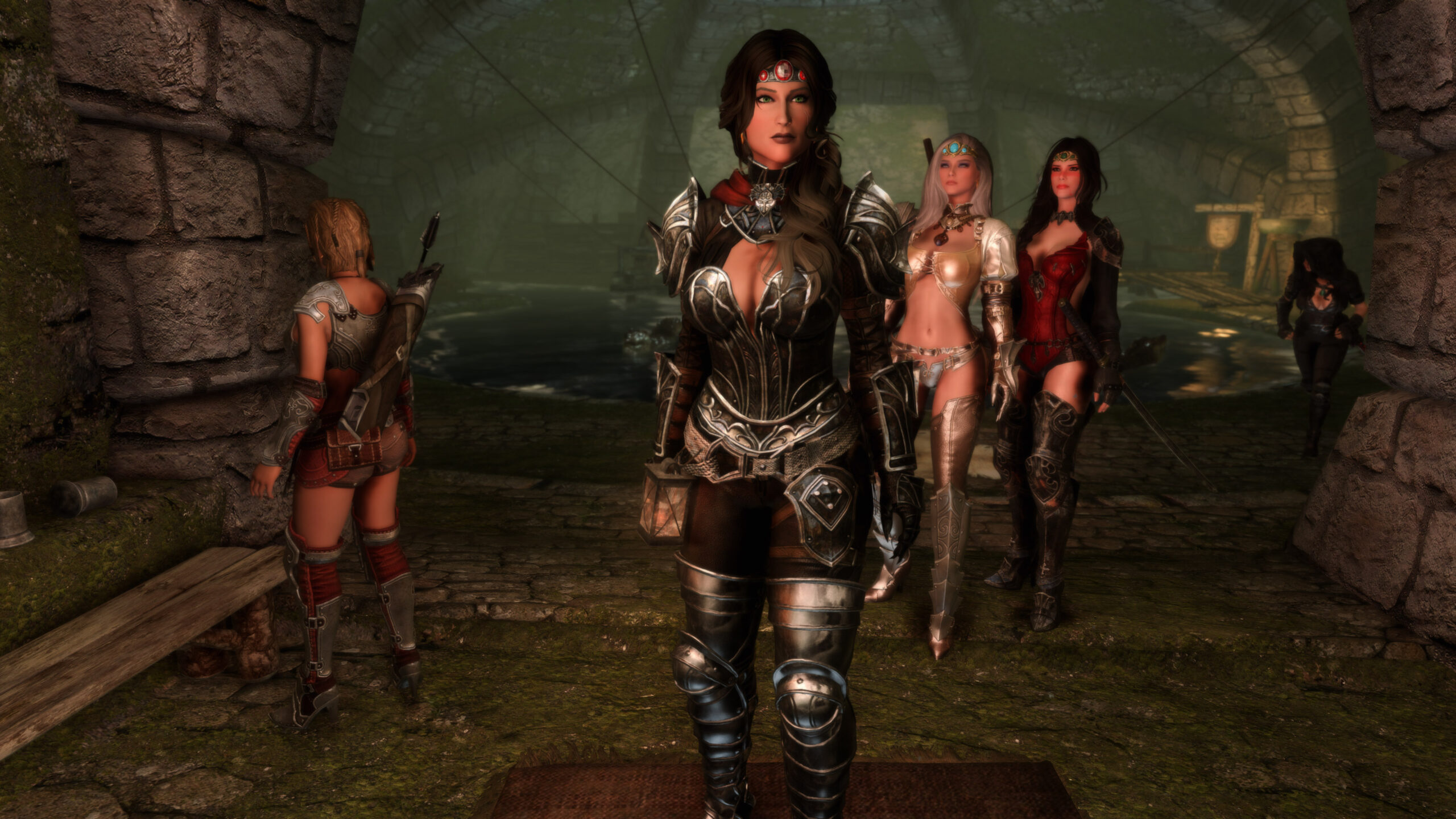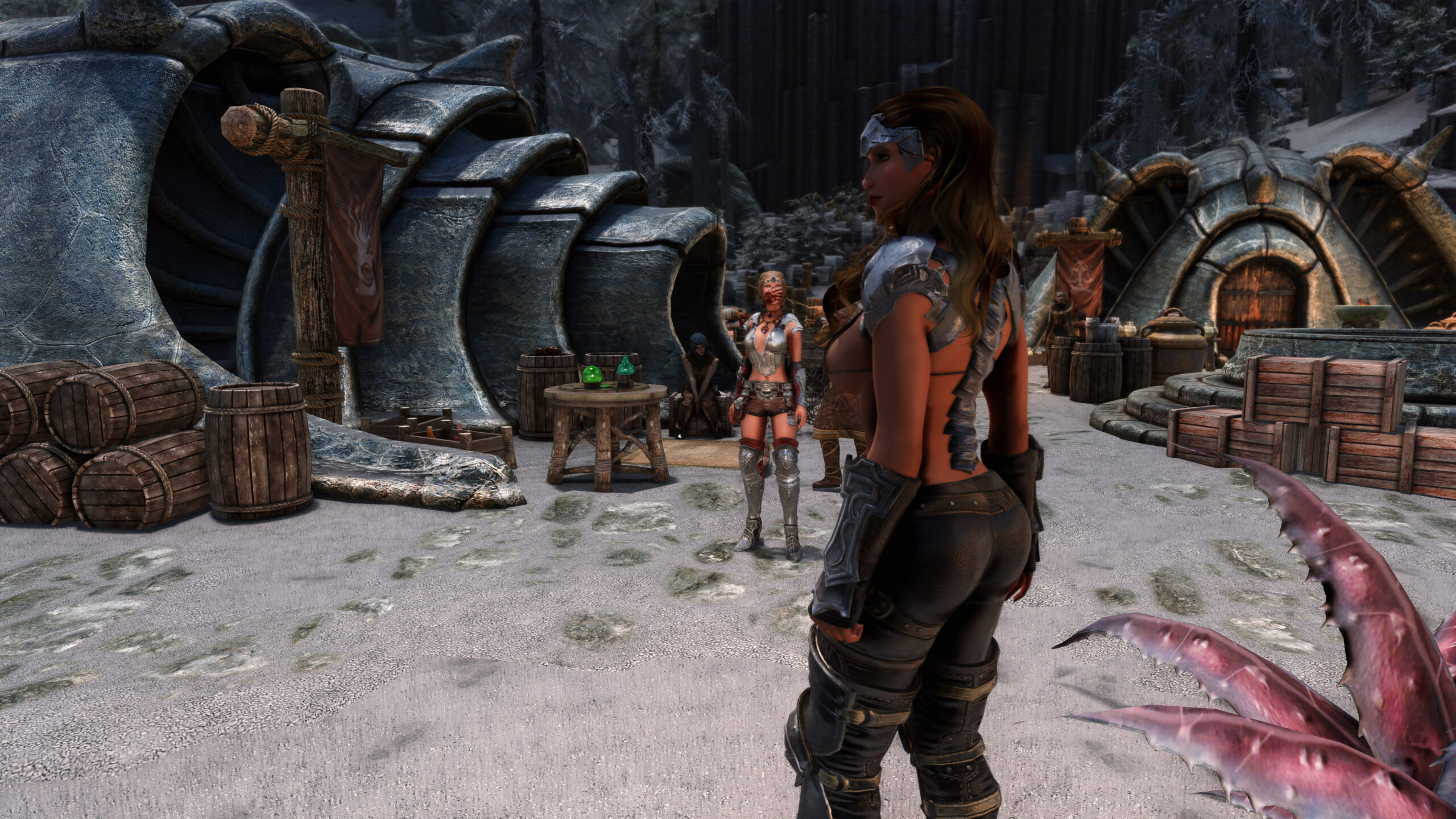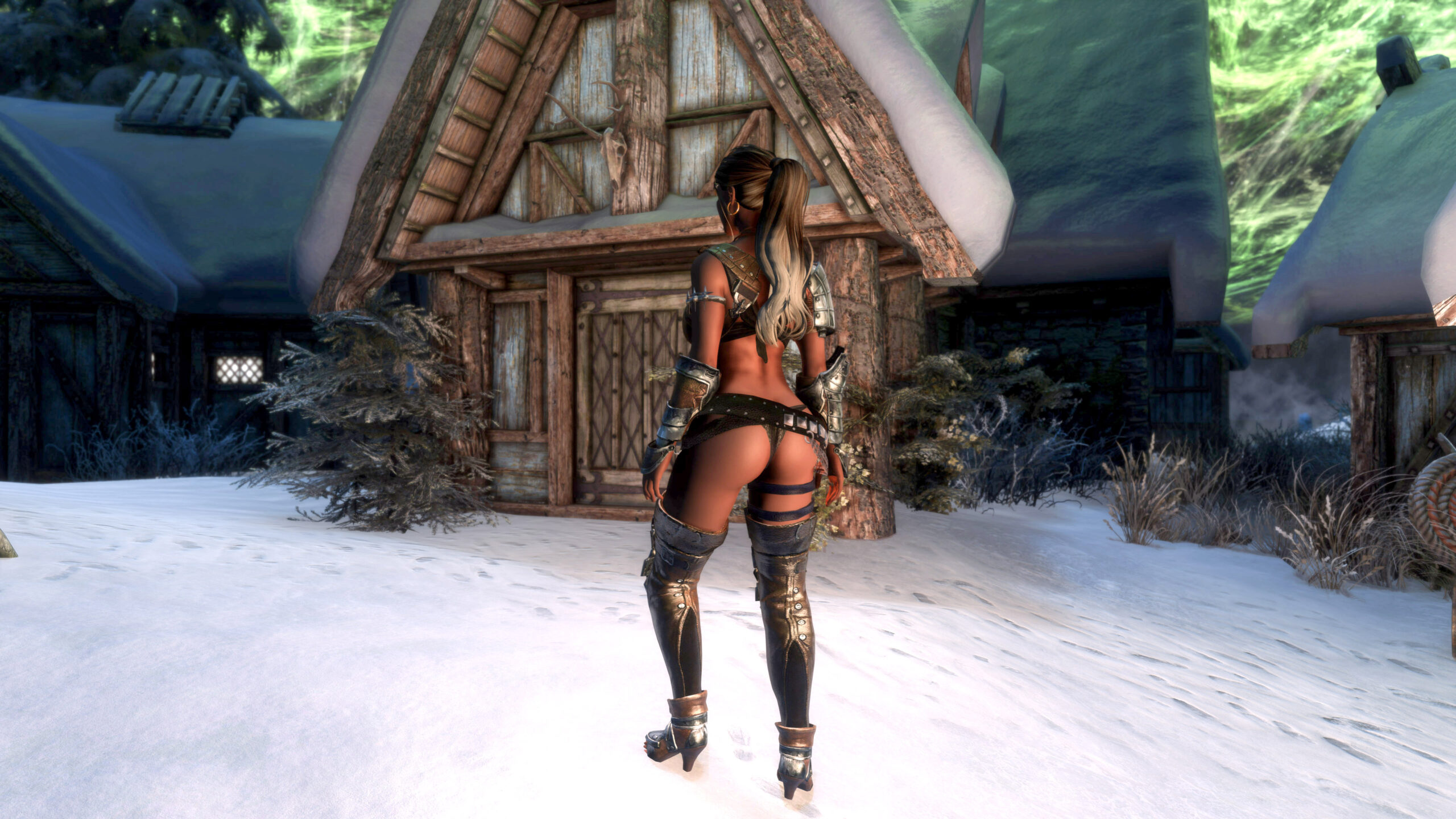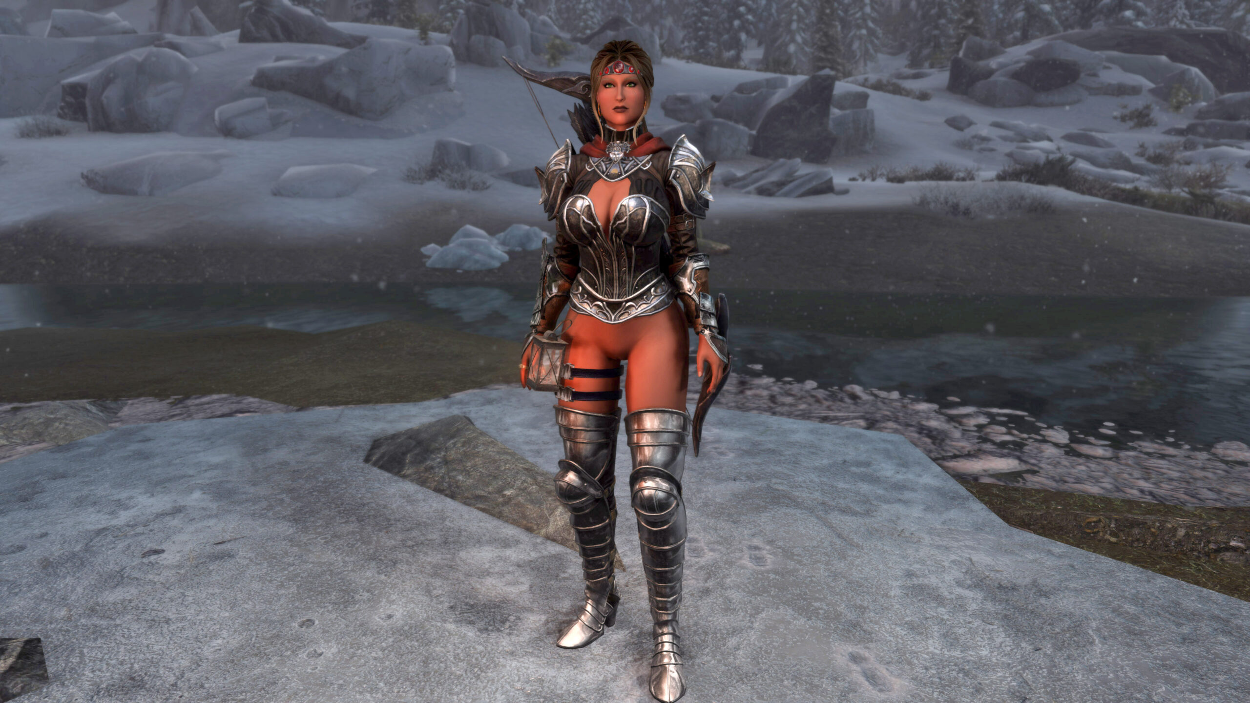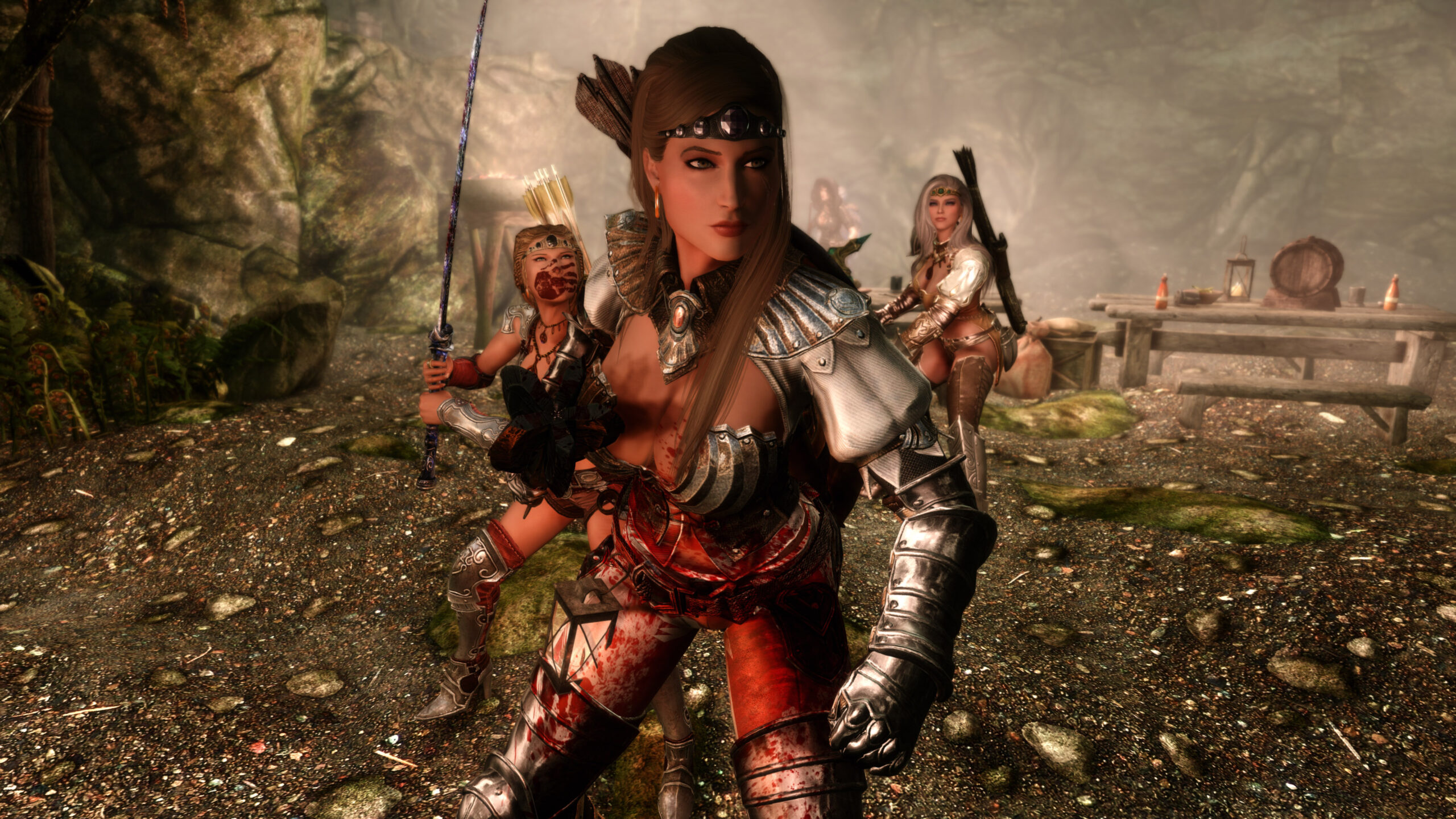 Gwen has been around for over 7 years now. She is my go-to when I want to just play Skyrim. She is a fearless leader, (sometimes too fearless). Tallest woman in Skyrim, biggest woman in Skyrim and one of the most ferocious fighters. Probably, pound for pound she has the biggest boobs in Skyrim along with a over muscular bubble butt, thanks to Dibella and her enhancements; Gwen leads without question and is the tank / barbarian of the group.