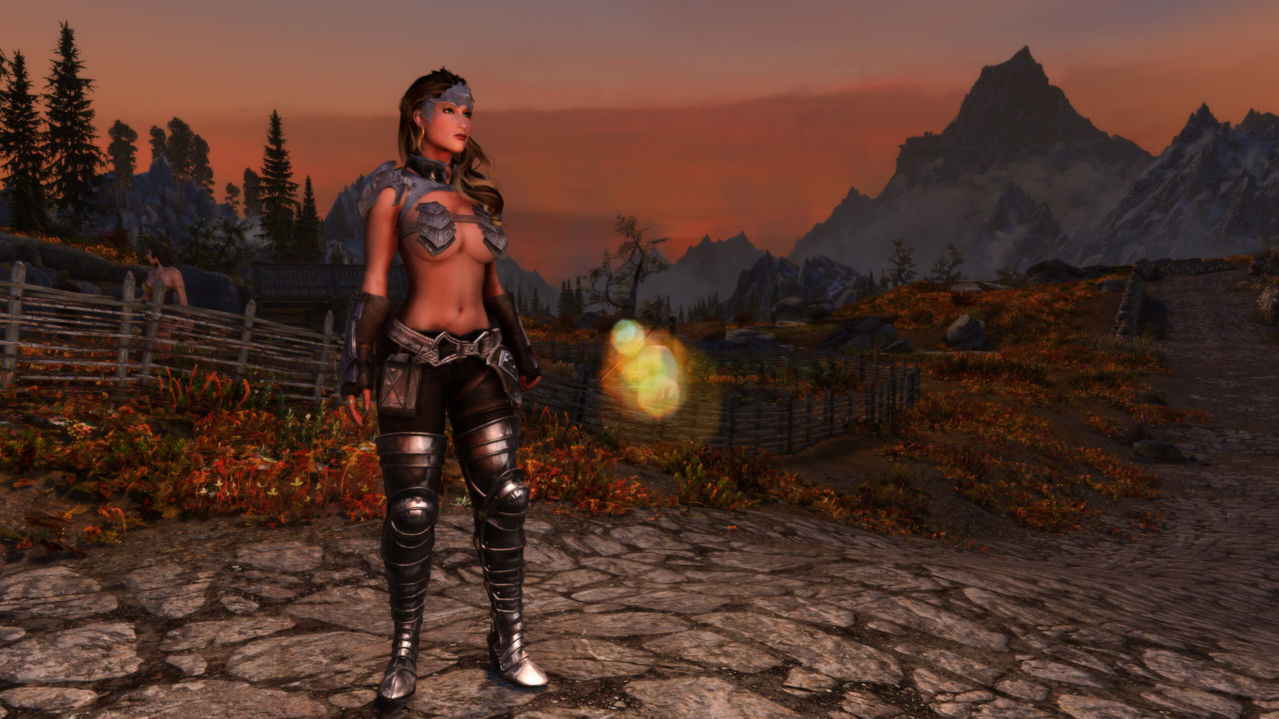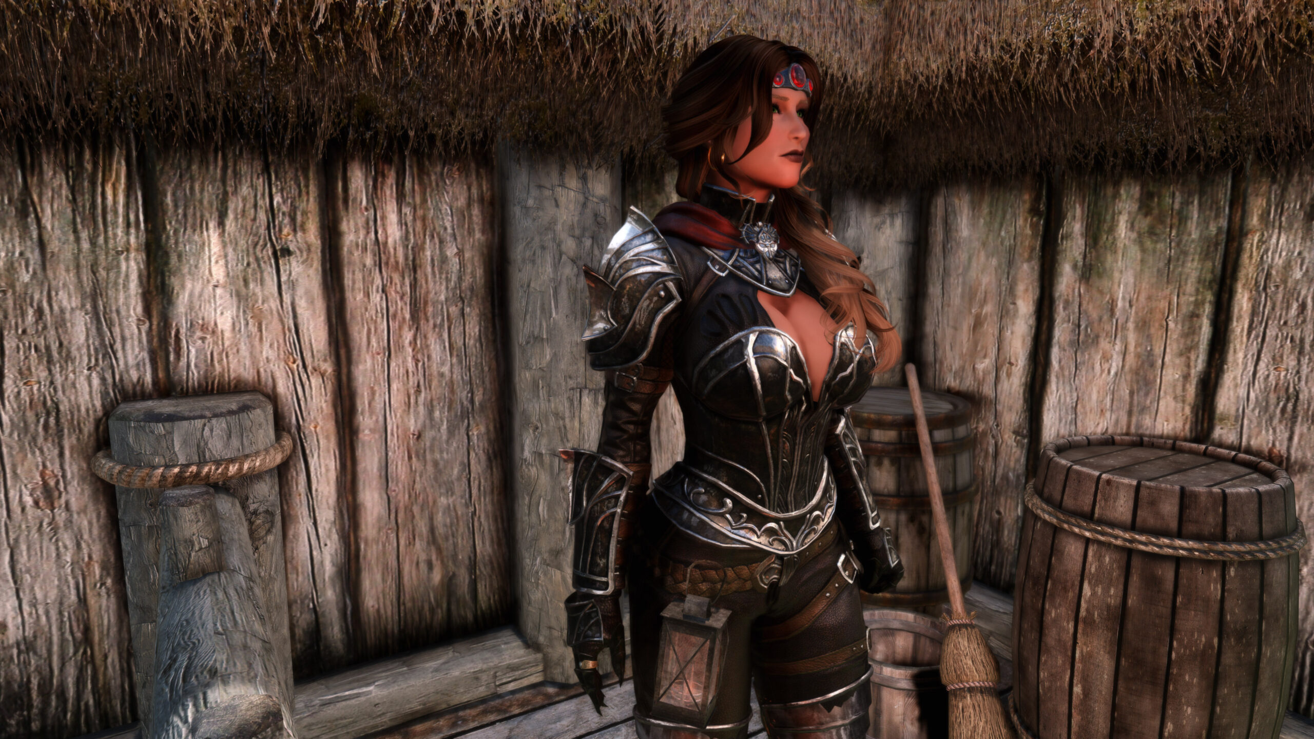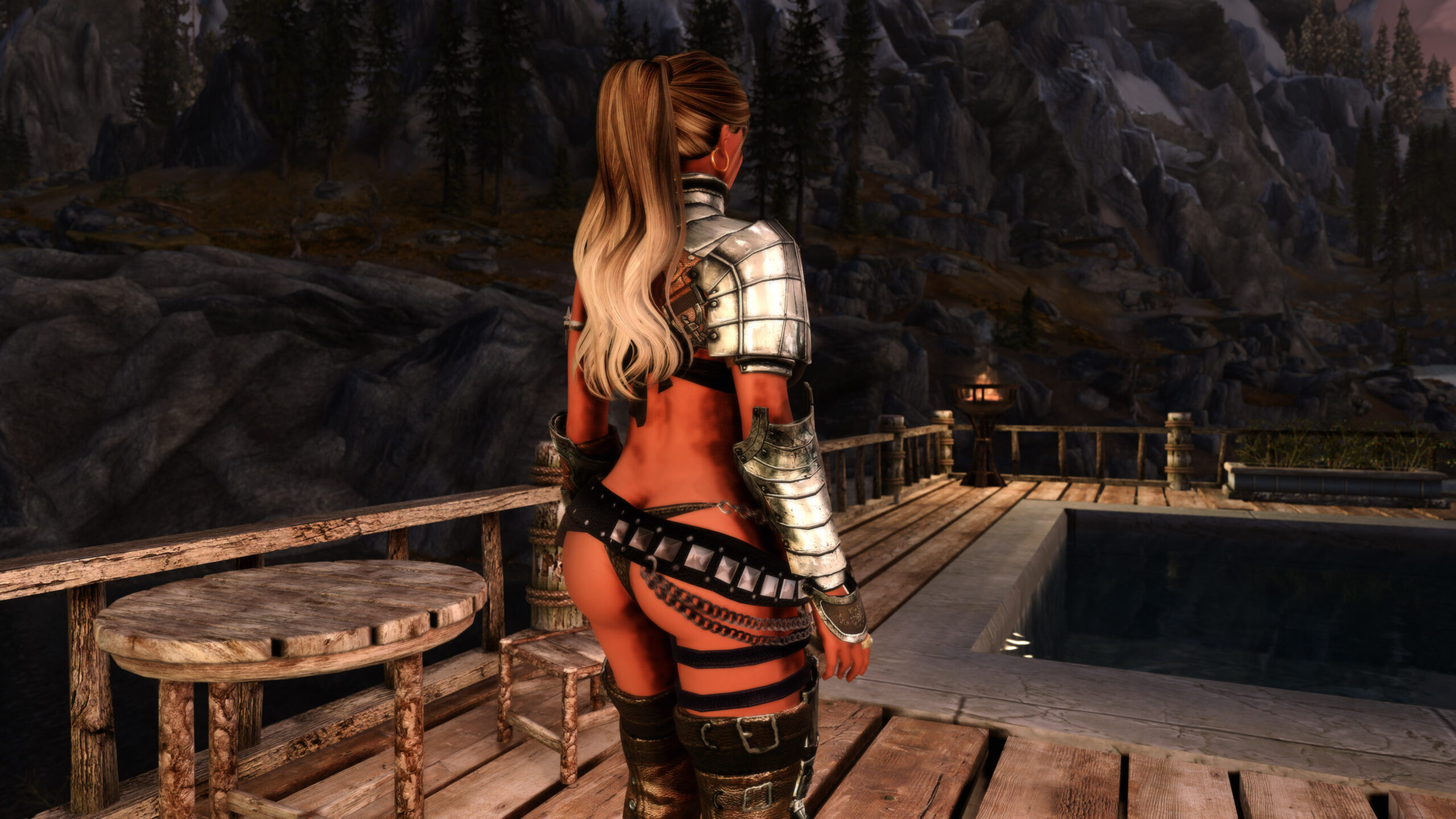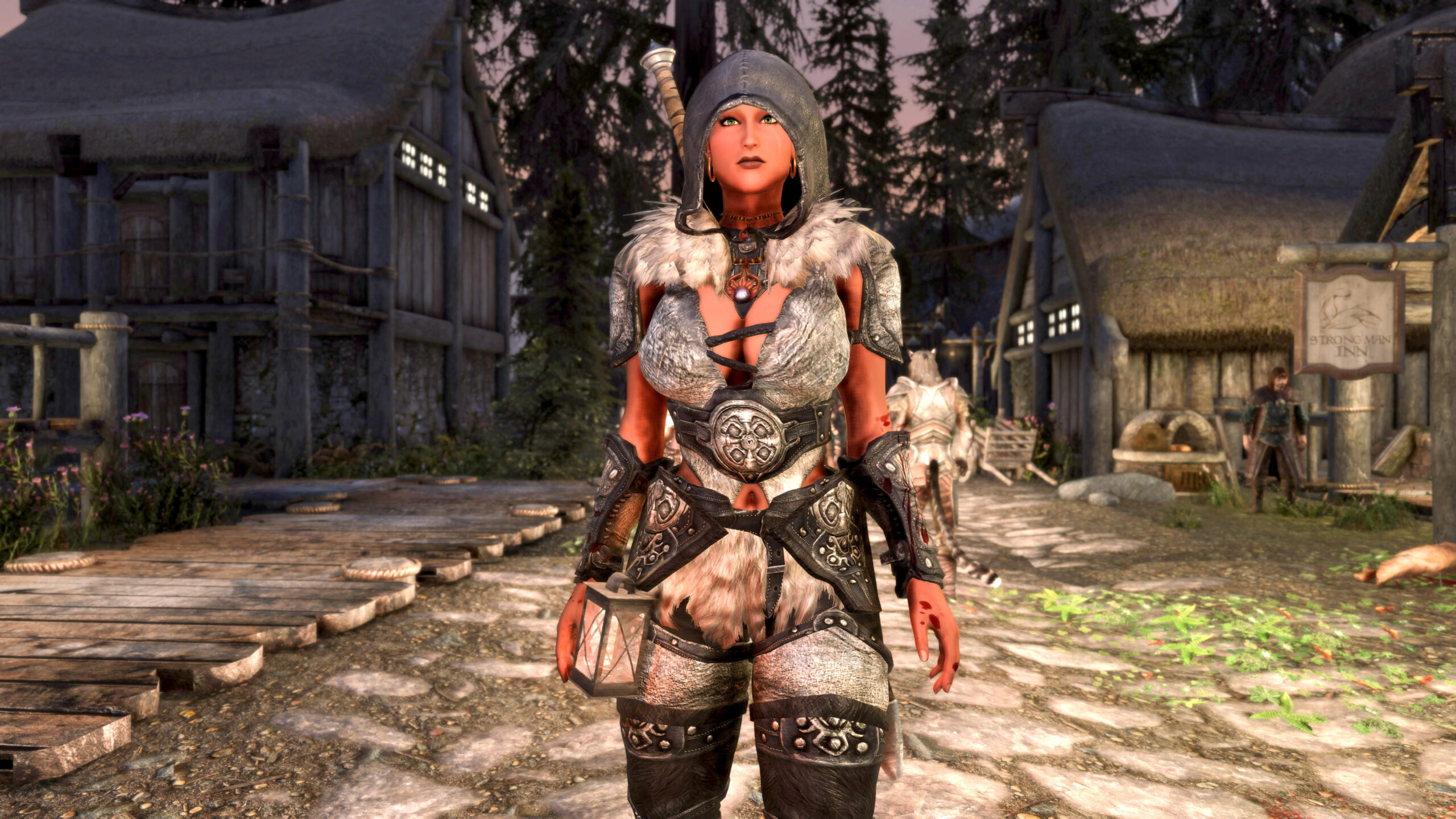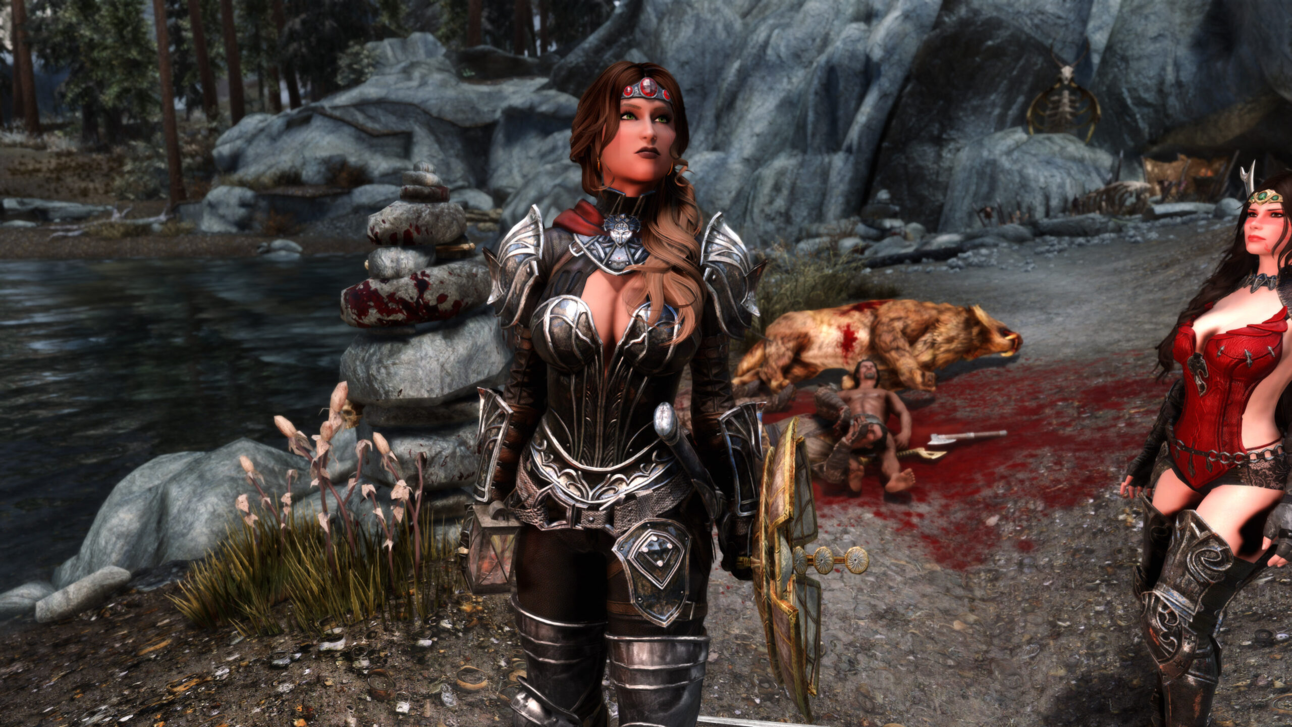 Gwen has been around for over 7 years now. She is my go-to when I want to just play Skyrim. She is a fearless leader, (sometimes too fearless). Tallest woman in Skyrim, biggest woman in Skyrim and one of the most ferocious fighters. Probably, pound for pound she has the biggest boobs in Skyrim along with a over muscular bubble butt, thanks to Dibella and her enhancements; Gwen leads without question and is the tank / barbarian of the group.