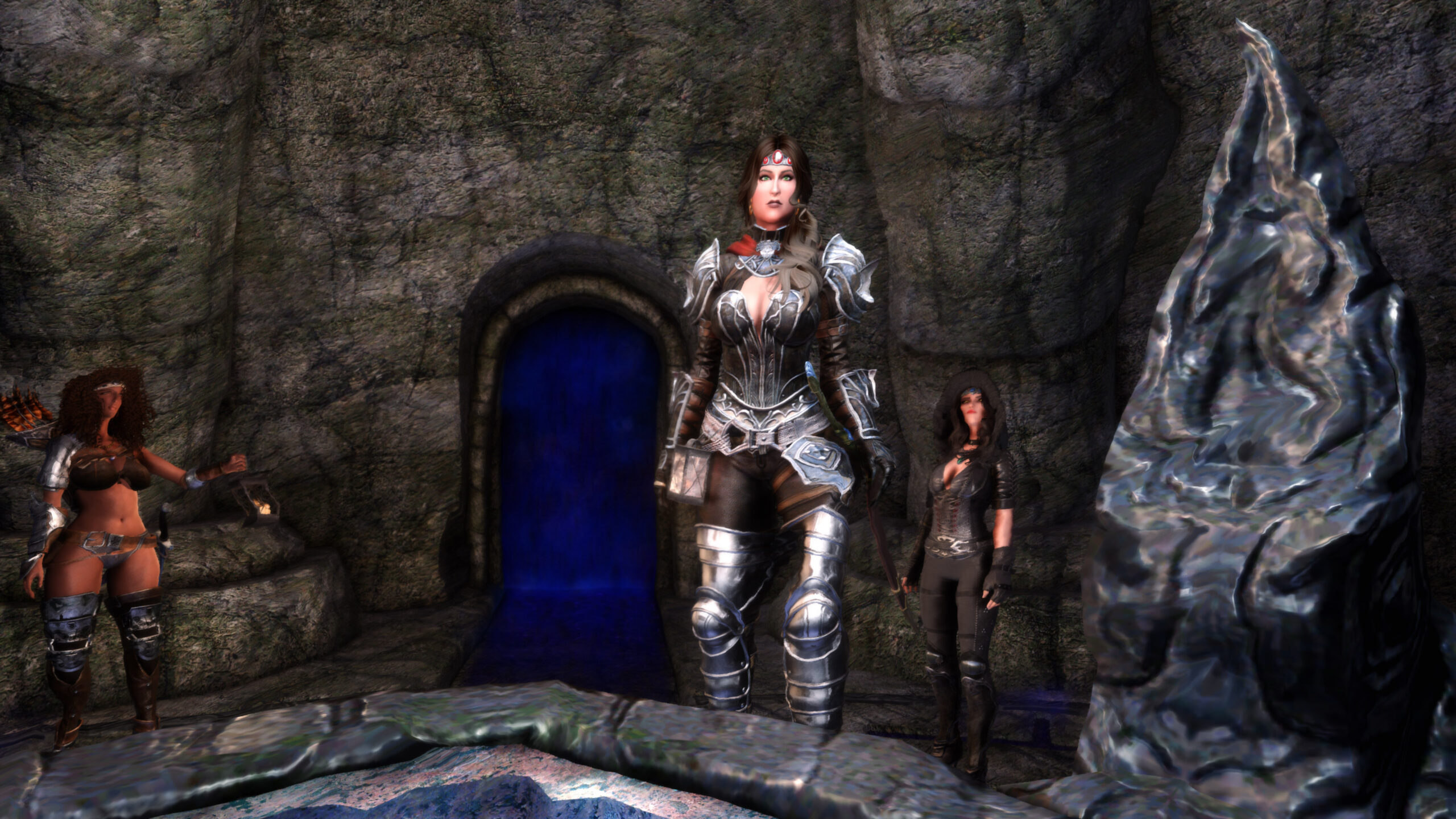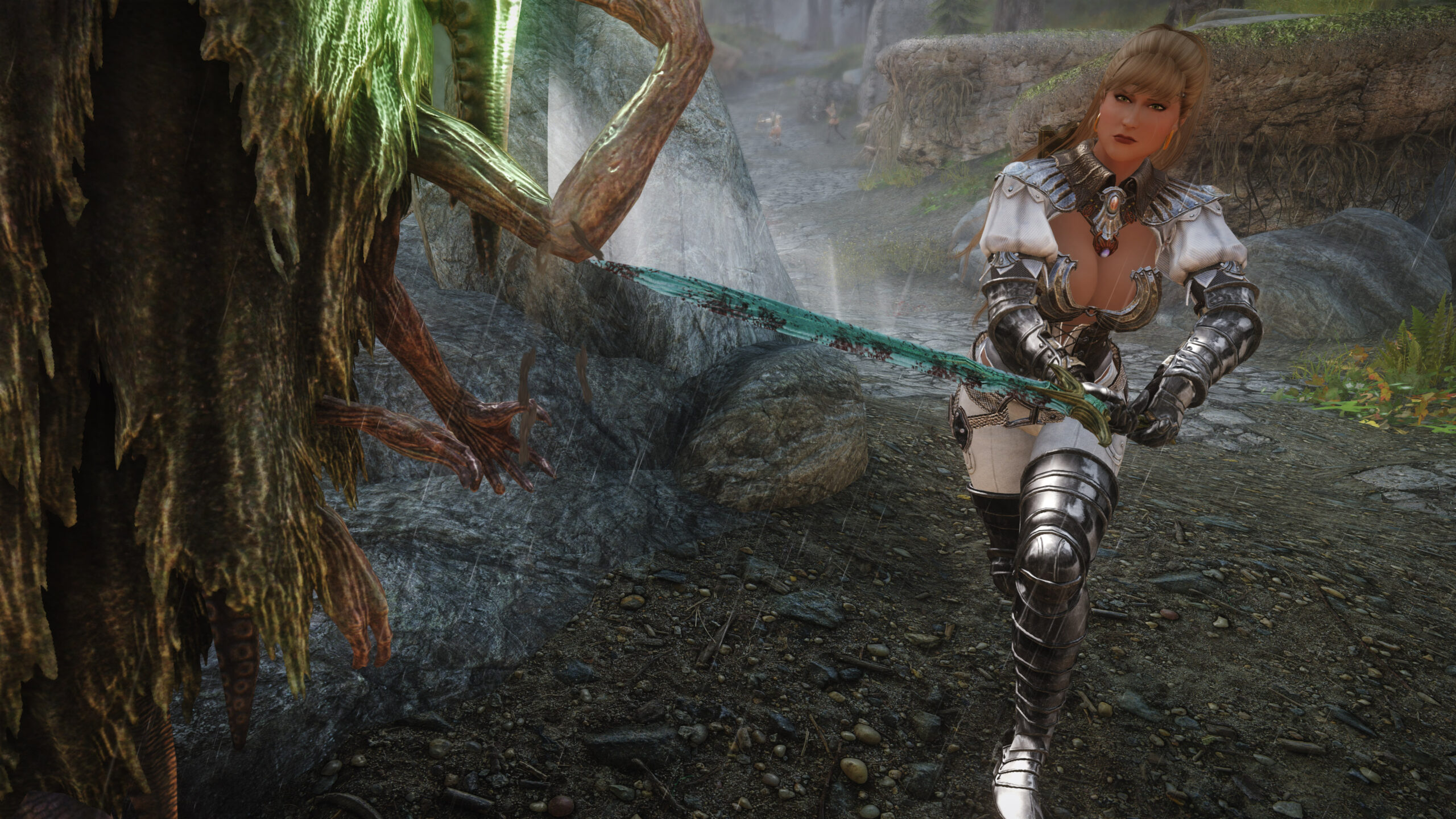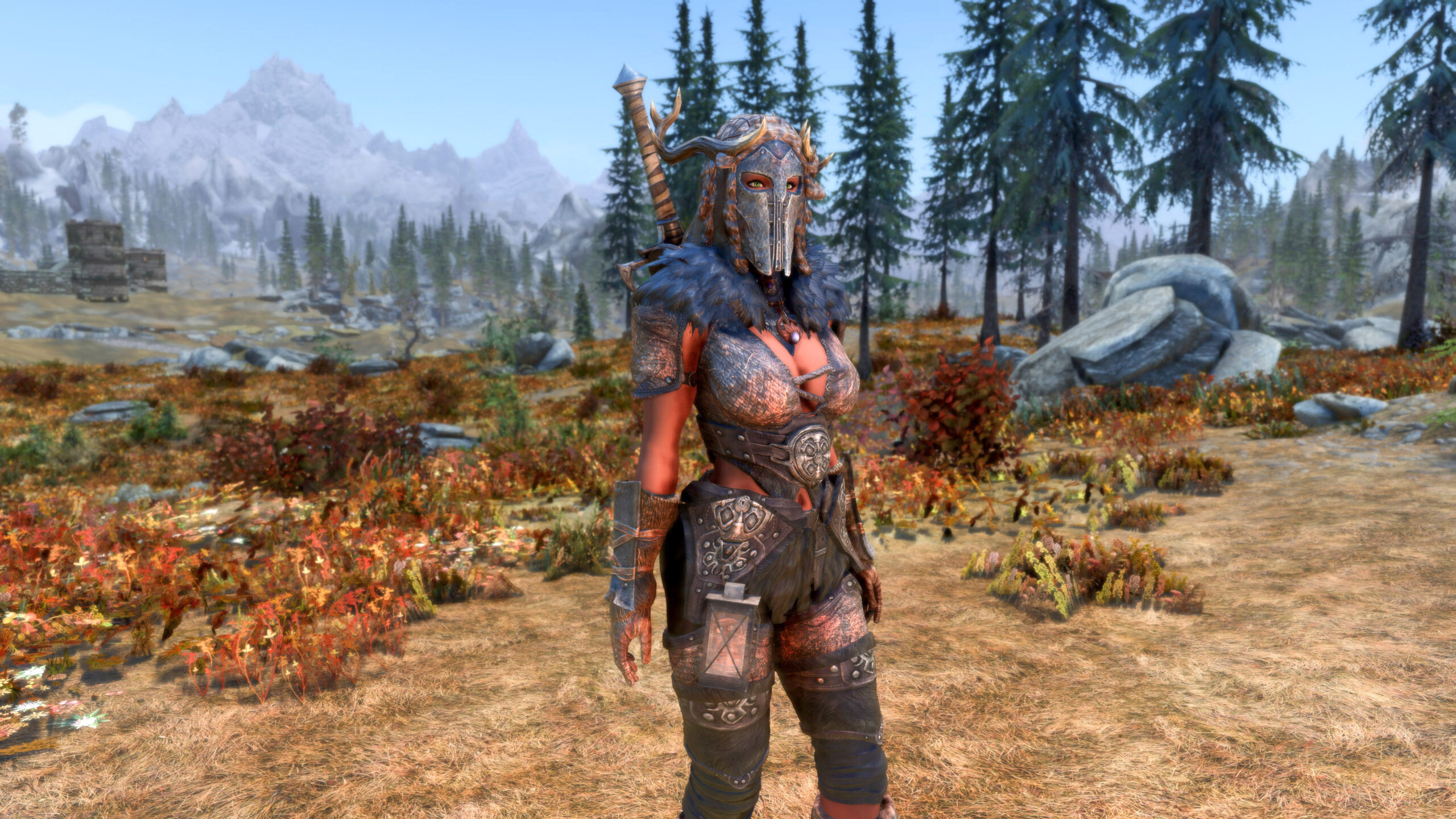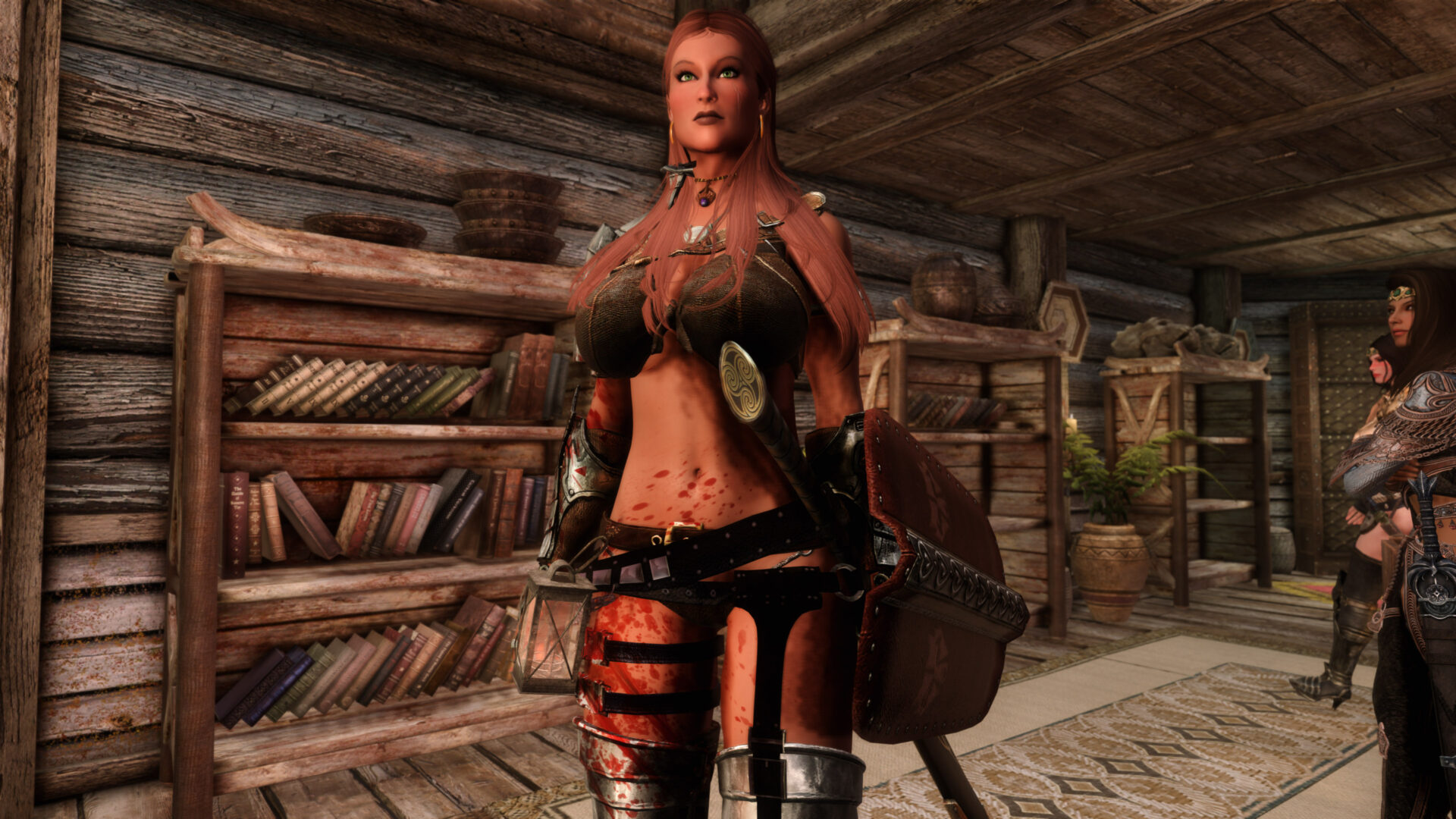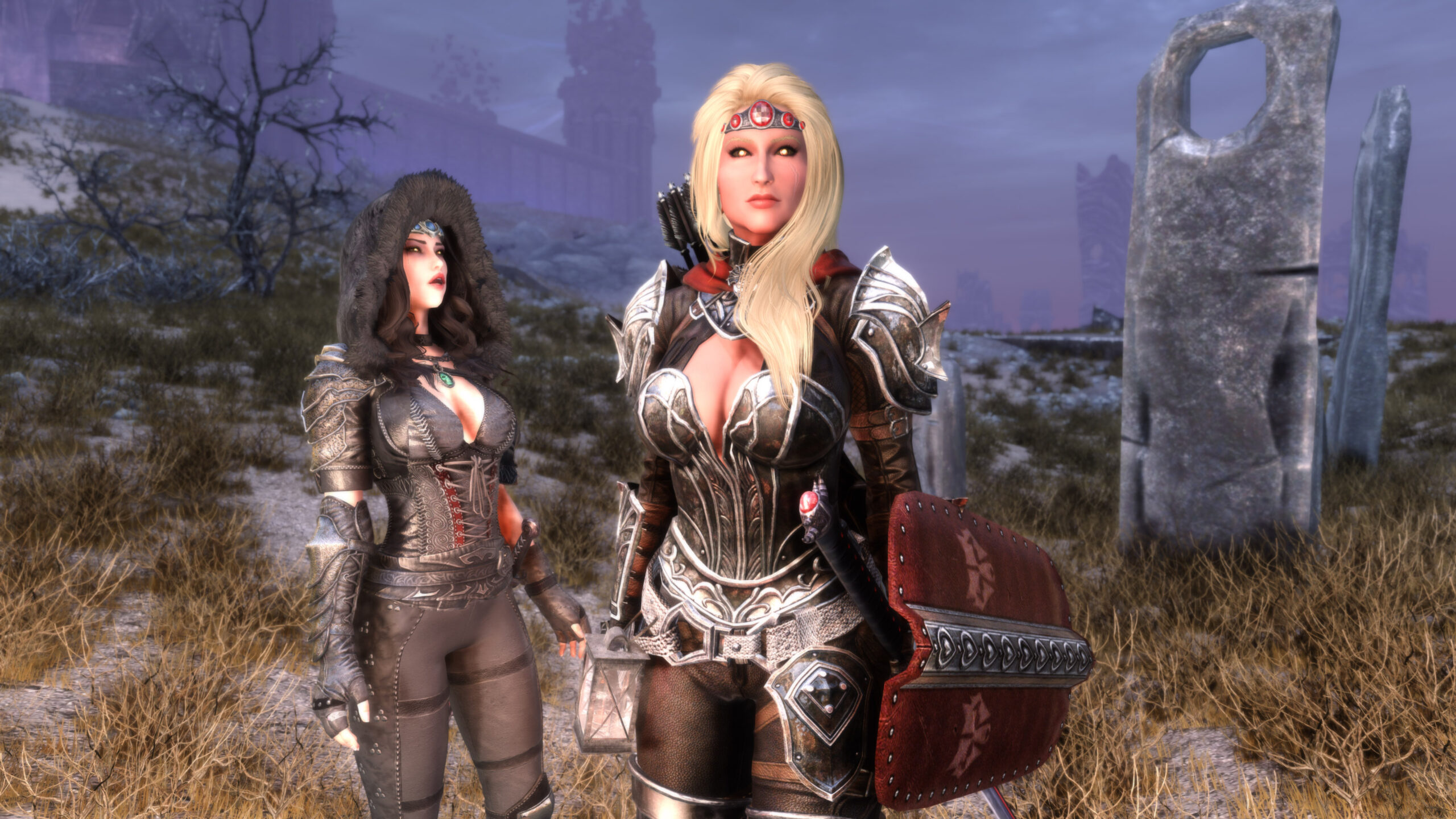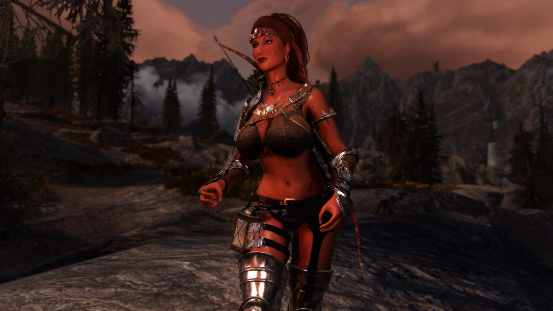 Gwen has been around for over 7 years now. She is my go-to when I want to just play Skyrim. She is a fearless leader, (sometimes too fearless). Tallest woman in Skyrim, biggest woman in Skyrim and one of the most ferocious fighters. Probably, pound for pound she has the biggest boobs in Skyrim along with a over muscular bubble butt, thanks to Dibella and her enhancements; Gwen leads without question and is the tank / barbarian of the group.