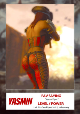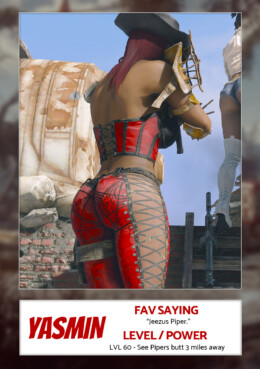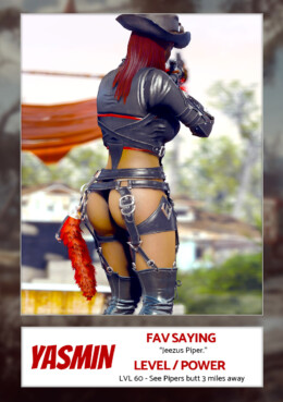 Below is the trading cards I used for my streaming character Yasmin.She was my true first streaming character and we started around level 5 or so. It was on a whim because I created her a while back to experiment on things and well, she was at the right place at the right time.